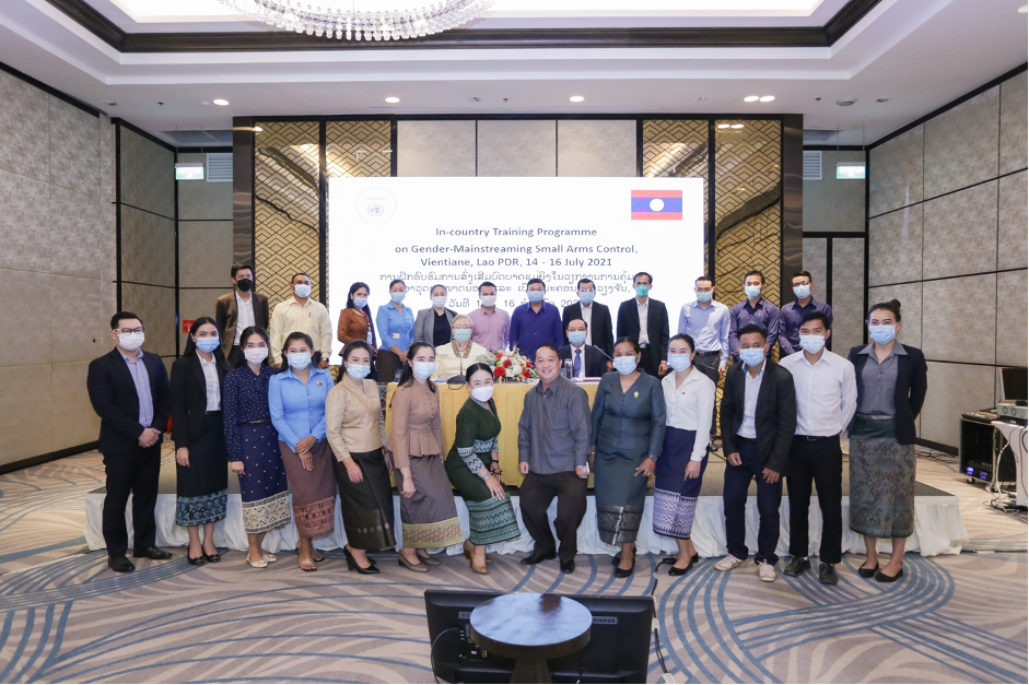 From 14 July to 16 July 2021, the United Nations Regional Centre for Peace and Disarmament in Asia and the Pacific (UNRCPD) in partnership with the Ministry of Foreign Affairs of the Lao PDR and funding from the European Union organized a training on gender mainstreaming small arms control for Laotian officials. Due to the COVID-19 related restrictions on travelling, the training was conducted in a hybrid format: participants gathered in person at the Crowne Plaza Hotel in Vientiane, while UNRCPD trainers, as well as other invited experts, joined via webex and delivered presentations virtually. The training aimed at enhancing the understanding of key government officials of the relevance of gender considerations and gender responsive approaches to small arms control and equipping them with the tools to translate into practice the commitments made under SALW global instruments, such as the UN PoA. The training also raised awareness of other key instruments, such as the ATT. In total thirty-two government officials (17 women, 15 men) took part in the training, representing the following agencies and unions: Customs, Defense, Education & Sport, Finance, Foreign Affairs, Industry & Commerce, Justice, National Assembly, Prime Minister Office, Public Security, Small Arms Import / Export Agency, Women Union, Youth Union. Experts included UNFPA and UN Women.